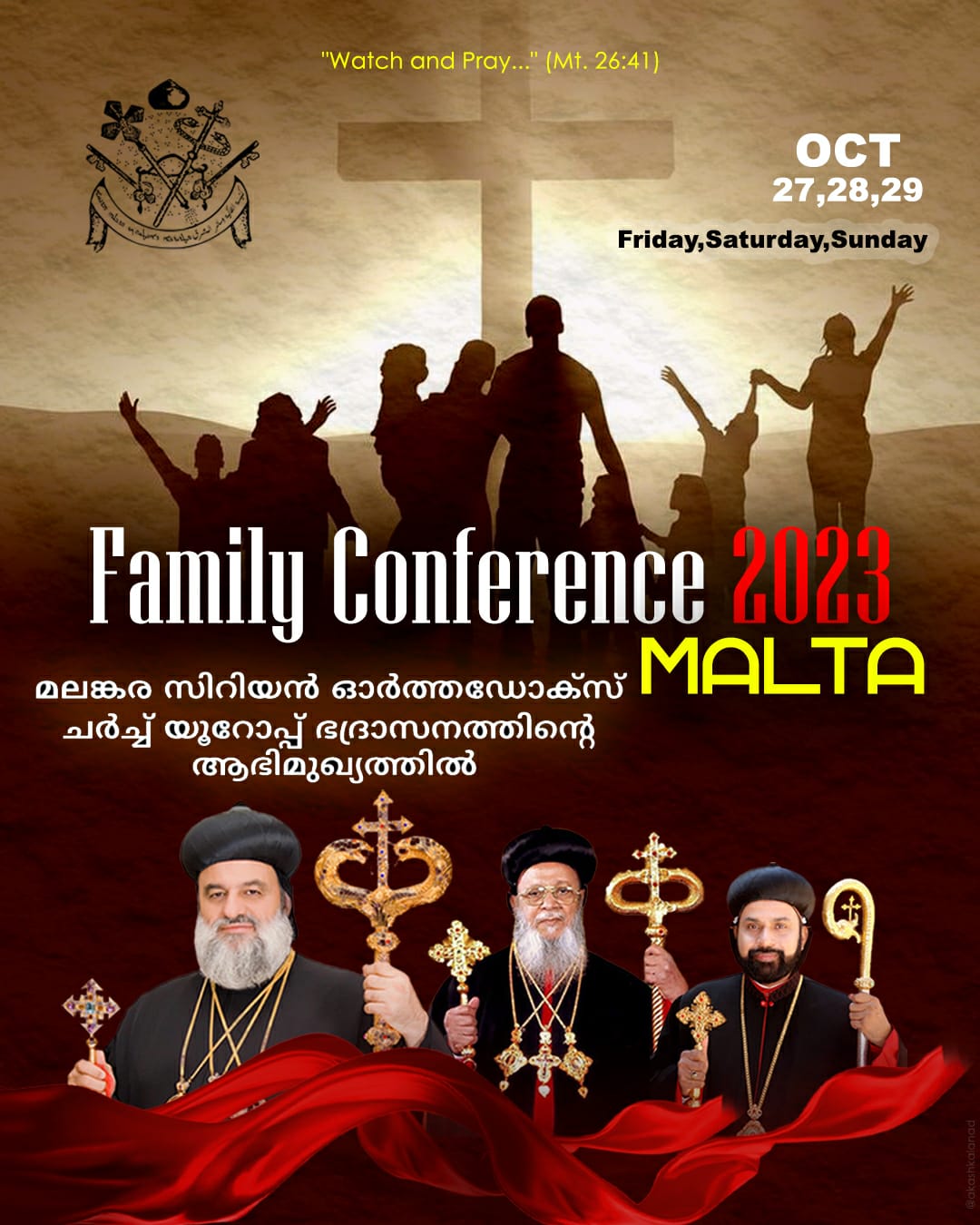 മലങ്കര സുറിയാനി ഓർത്തഡോൿസ് യൂറോപ്പ് ഭദ്രാസന ഏഴാമത് ഫാമിലി കോൺഫറൻസ് 2023 ഒക്ടോബർ 27,28,29 തീയതികളിൽ മാൾട്ട സെന്റ് മേരിസ് മലങ്കര സുറിയാനി ഓർത്തഡോൿസ് പള്ളിയിൽ വച്ച് നടത്തപ്പെടുന്നു.